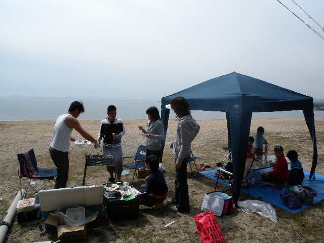 びわ湖の浜でバーベキューをしているファミリーがいました。「写真とらせてー」「はーいどうぞー」「あやしいもん違うしねー」「・・・ ・・・ ・・・」