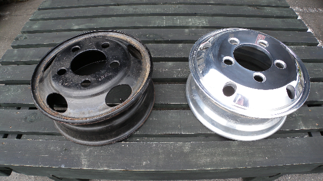 左はトヨタコースターの純正スチールホイル、右は当社が取り扱う鍛造アルミホイル アルエックス。