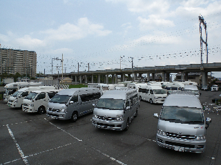 ずらりと並んだキャンピングカーがお客様を待ってま〜す。